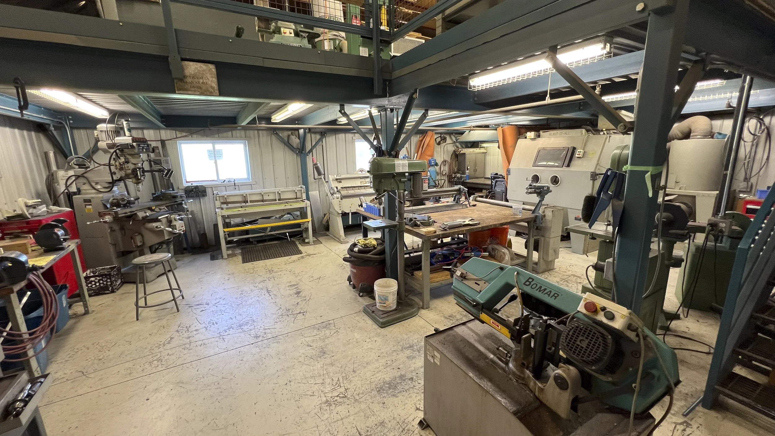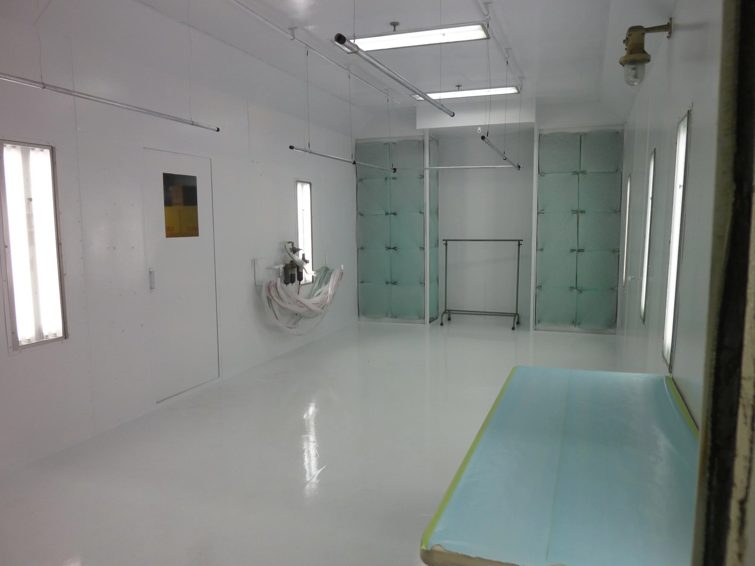 Paint booth, parts department, offices, library, meeting/board room and lounge.